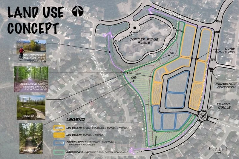 The site's northern portion is envisioned as lower-density residential with a mix of single-detached and duplex housing. Moving south, the built form transitions gradually in scale to a more intensive built form. A mix of duplex/triplex housing types is provided midblock, and a more intensive medium density wraps around the southern edge of the site. The greenspace plan is a centrepiece of this land use concept. A linear open space along Copper Ridge Place provides outdoor amenity spaces and facilitates safe connections to the future development area. With a mix of hard and softscape elements, the open space can accommodate a range of formal and informal activities.
